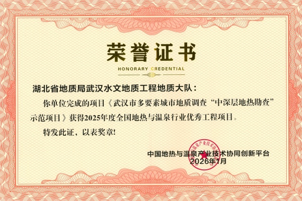 2026年1月16日至18日,2025地热产业企业家论坛暨平台年会在河南郑州召开。湖北省地质局武汉水文地质工程地质大队承担的《武汉市多要素城市地质调查“中深层地热勘查”示范项目》荣获“2025年度全国地热与温泉行业优秀工程项目”。