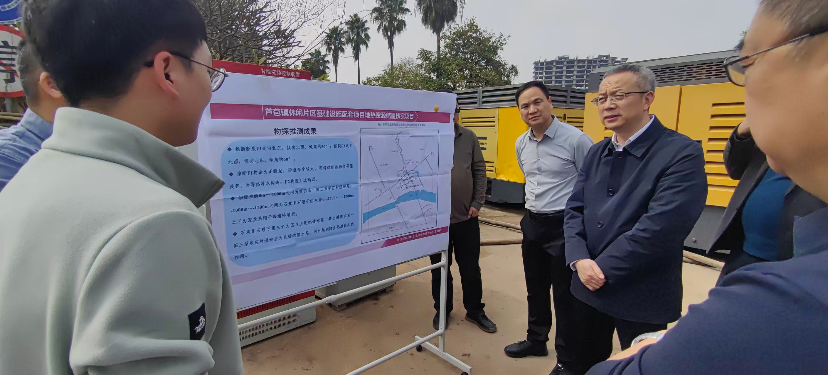 双方参观了芦苞镇休闲片区基础设施配套地热资源储量核实项目,现场围绕深层钻探、物探技术、质量安全、成本控制等方面展开交流讨论,就进一步加强地热资源勘查开发利用合作等方面达成一致意见。